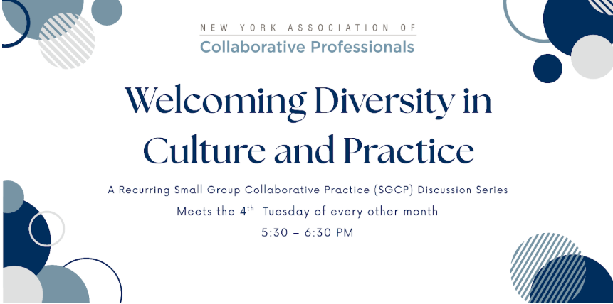 Exciting News-A new Support Group is being formed - Collaborative Practice (SGCP) "Welcoming Diversity in Culture and Practice" has launched with meetings on the 4th Tuesday of every other month from 530-630pm beginning October 28th, thereafter Dec, Feb, April, and June - of which December and June will be scheduling a field trip focusing on diversity in culture. This group will support members who want to be thoughtful about the impact of identity and culture in their collaborative work and are eager to collaborate with like-minded colleagues to help put the "how" into the "what" we commit to. This SGCP, like all SGCP groups, will require commitment of participation and is open to all NYACP members. Contact Sarah at [email protected], Melissa Goodstein at [email protected], or Catherine Canade at [email protected] for more information.