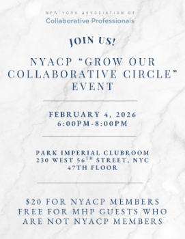 Now, more than ever, NYACP is committed to supporting the mental health community as they champion our work. To foster this essential relationship, we invite MHPs who have an interest in learning more about the collaborative divorce process to be our guests at our 2026 kickoff "Cocktails and Conversation" event. We are excited to welcome our NYACP members and encourage you all to invite MHP friends and colleagues who share our values and commitment to families going through divorce.